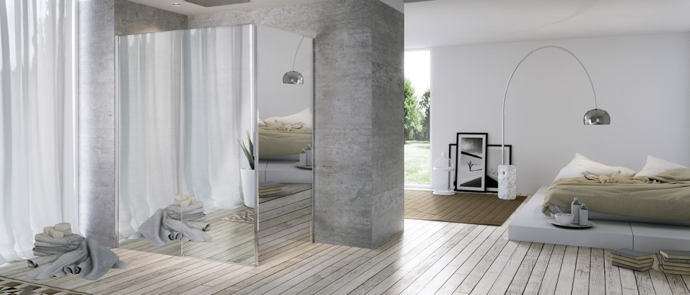 The mirror glass is manufactured in a complex chrome plating process under vacuum, by cathodic pulverization, without the deposition of silver or aluminum on the surface. The new surface has no influence on the properties of the shower wall. It can be tempered and treated to counteract halos and limestone. In addition, the glass is resistant to scratches, condensation, acid attacks and salt spray and is particularly suitable for rooms with high humidity. Available in 8 mm thickness.