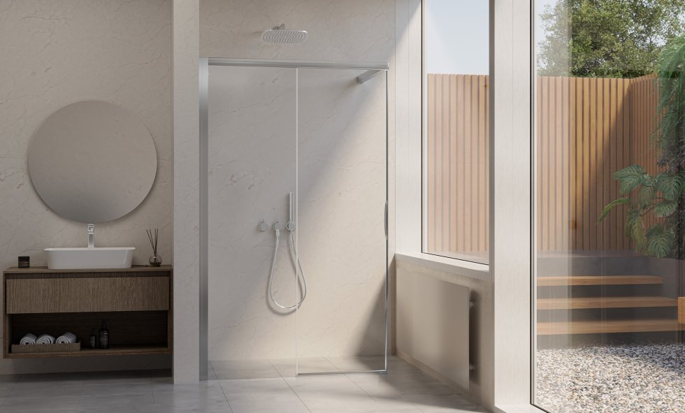 The new sliding door is the perfect choice for bathrooms where side elements cannot be installed, such as in the presence of large windows, radiators or specific architectural constraints. It provides a smart and stylish solution for complex spaces and enables unique, functional, and aesthetically striking configurations.