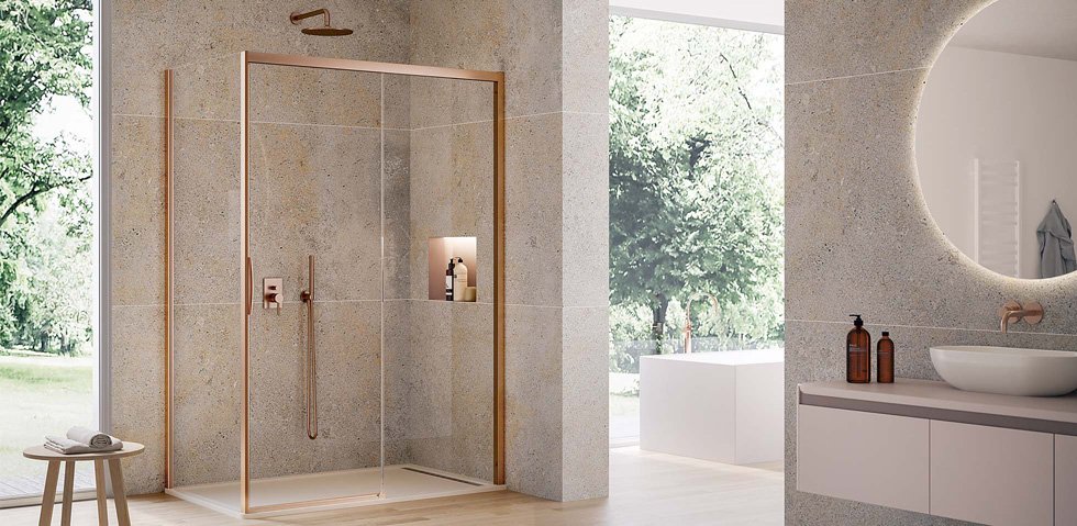 I profili, le maniglie, le cerniere e altre componenti strutturali si trasformano in eleganti dettagli decorativi grazie alle nuove e brillanti finiture metalliche copper pearl, brass pearl e black pearl; le cabine doccia diventano, così, ‘superfici’ sempre più personalizzabili, da declinare in diverse configurazioni a seconda dello spazio - domestico, wellness o dell’hotellerie - che le accoglie e rispondere alle differenti esigenze abitative e gusti individuali.