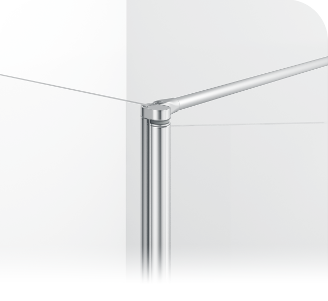 Les charnières sont fixées au verre avec la technique innovante de collage UV “Brillant”. Cette technologie de collage UV développée à Duka souligne les nouvelles formes épurées des éléments et met pleinement en valeur la brillance du matériel ainsi que la transparence maximale sur verre.