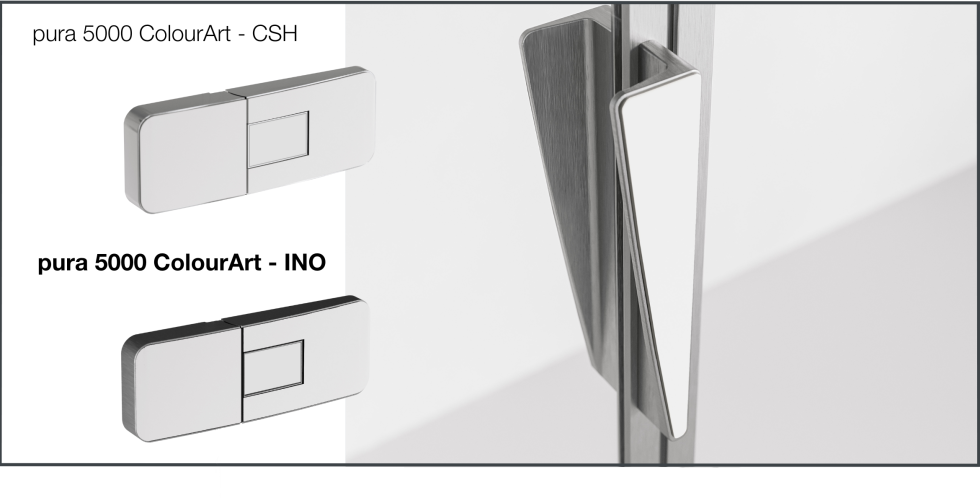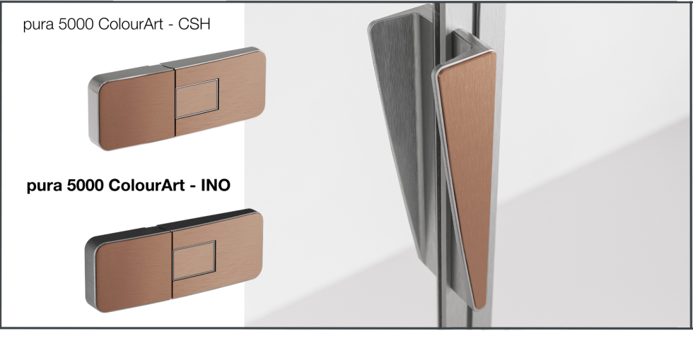 La serie pura 5000 con le sue porte battenti di alta qualità in look acciaio inox cattura subito lo sguardo nel tuo ambiente bagno. La finitura inox si adatta perfettamente anche a pura 5000 nella versione ColourArt con i nuovi colori metal brushed copper, metal brushed brass, metal brushed black, metal matt black e metal matt white. La finitura in inox del profilo, delle cerniere e delle maniglie crea un contrasto cromatico mettendo così in maggiore luce i dettagli colorati della cabina doccia.