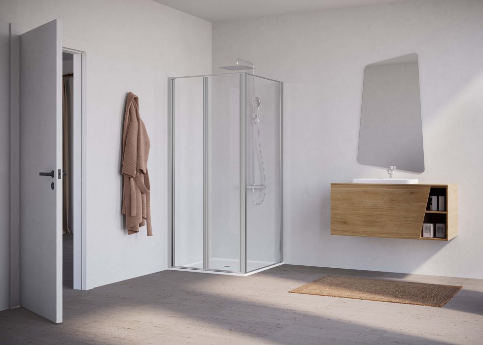 - Il design minimalista si esprime anche attraverso il sistema di scorrimento: con un’altezza di soli 35,5 mm si integra perfettamente nell’estetica pulita del prodotto. La combinazione tra un intervallo di regolazione di 30 mm sulla cabina doccia e l’utilizzo del profilo di allargamento permette di gestire facilmente diverse larghezze, così da assolvere a differenti esigenze. I cuscinetti a sfera, dotati di una regolazione in altezza di ± 2,5 mm, assicurano il perfetto parallelismo delle porte, tutelando la perfetta funzionalità e precisione nel tempo.
