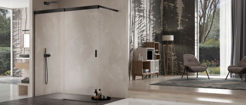 Dopo l’inserimento del vetro, si vede solo un piccolo listello di alluminio di copertura, a filo piastrella. Una versione che esalta al massimo la bellezza e trasparenza del vetro, con una pulizia ancora più semplice e veloce. Anche in questa versione tre colori nei listelli d’alluminio e svariati tipi di vetro contribuiscono all’ampia scelta individuale.