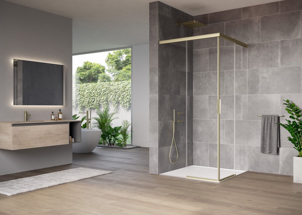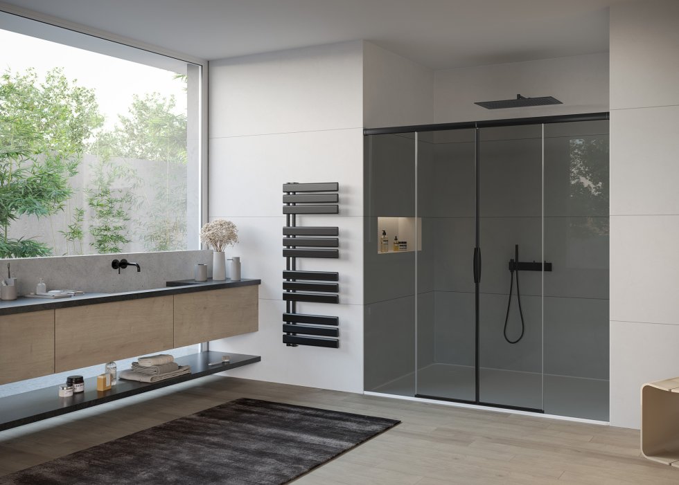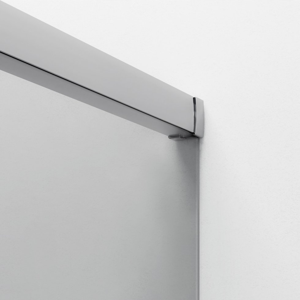 Das neue obere horizontale Profil der Seitenwand wird zu einem starken Anziehungspunkt, der der gesamten Duschkabine ein neues Gefühl von Durchgängigkeit und Harmonie verleiht.