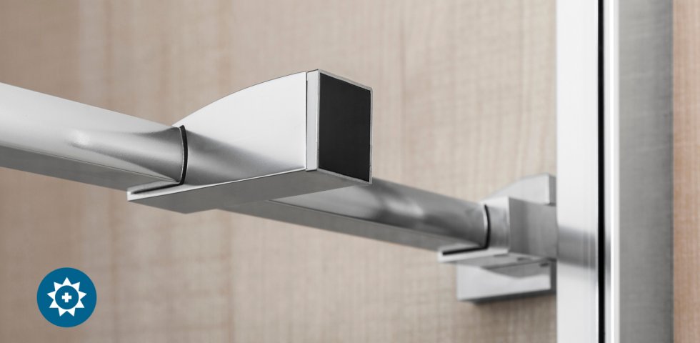 UV lijmtechnologie. Dit icoon geeft weer dat scharnieren en bevestigingsdelen hoogwaardig UV- verlijmd zijn aan het glas. Het glas is volledig vrij van randjes waar vuil en kalk zich kan aan hechten, waardoor het glas eenvoudiger te reinigen is.