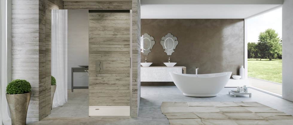 The mirror glass is manufactured in a complex chrome plating process under vacuum, by cathodic pulverization, without the deposition of silver or aluminum on the surface. The new surface has no influence on the properties of the shower wall. It can be tempered and treated to counteract halos and limestone. In addition, the glass is resistant to scratches, condensation, acid attacks and salt spray and is particularly suitable for rooms with high humidity. Available in 8 mm thickness.
