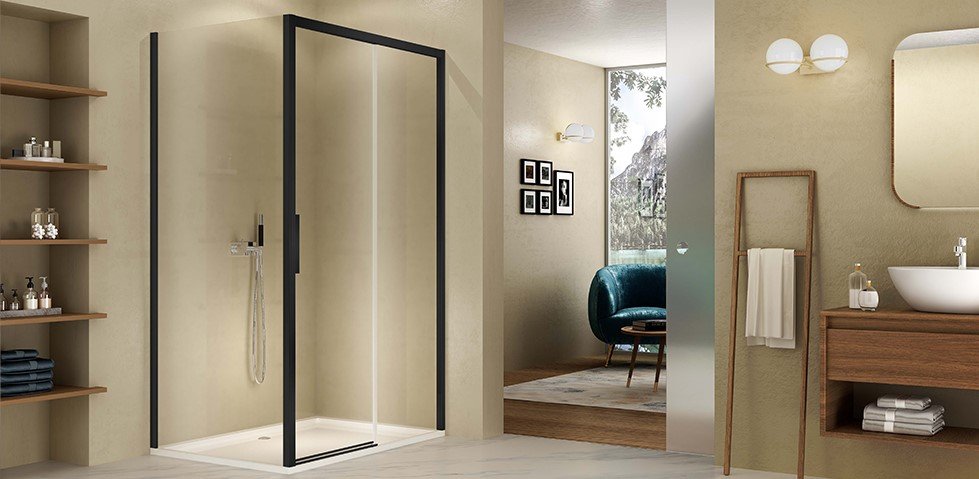 The clear, straight lines of the profiles of this series, which now shines with a new charm, speak the language of contemporary architecture. The handle, also in a dark colour, is designed with the utmost rigour and integrates into the magnetic closing profile like a precious accessory. The rubber insert avoids the impact between the aluminium and the glass and allows a good grip even with wet hands. The 180° hinges, which are screwed to the glass, allow maximum flexibility when opening and are enhanced in their form and function by the colour. The doors of stila 2000 with the up and down mechanism are automatically raised by a few millimetres when opened. This protects the drip rubber from constant abrasion and the door closes the last few millimetres by itself.