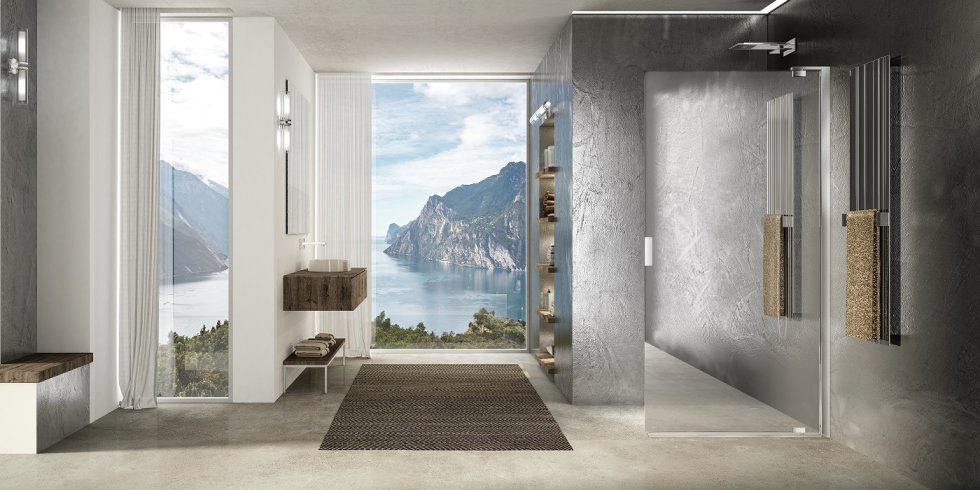 Mirror-effect chrome glass is now available for our corner entrance with swing door models in the natura 4000 and the libero 4000 lines, offering you a unique experience of space and shower. The chrome finish, essentially stainless steel, is applied to the outer side of the shower panel, does not impact on technical performance and retains a slight transparency which varies according to the brightness of the surroundings, transforming the glass into an architectural feature which adds to the illusion of space and creates an interplay with other bathroom fittings and furnishings. A unique solution, adding a whole new dimension to the role of a shower cabinet.