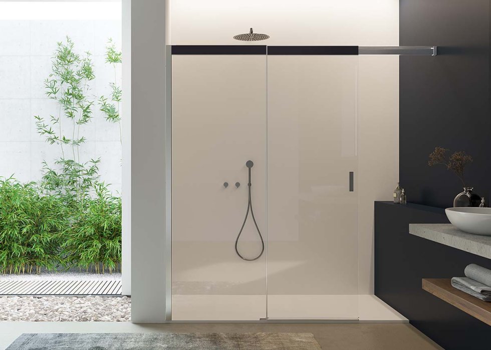 The sliding profile can, in fact, be adapted/cut as required and the support bar of the corner solution is eliminated so as not to create an obstacle, without compromising the functionality and stability of the shower enclosure. During showering, the mobile element can be closed, providing optimal protection from splash water whilst preserving the Walk In feature.