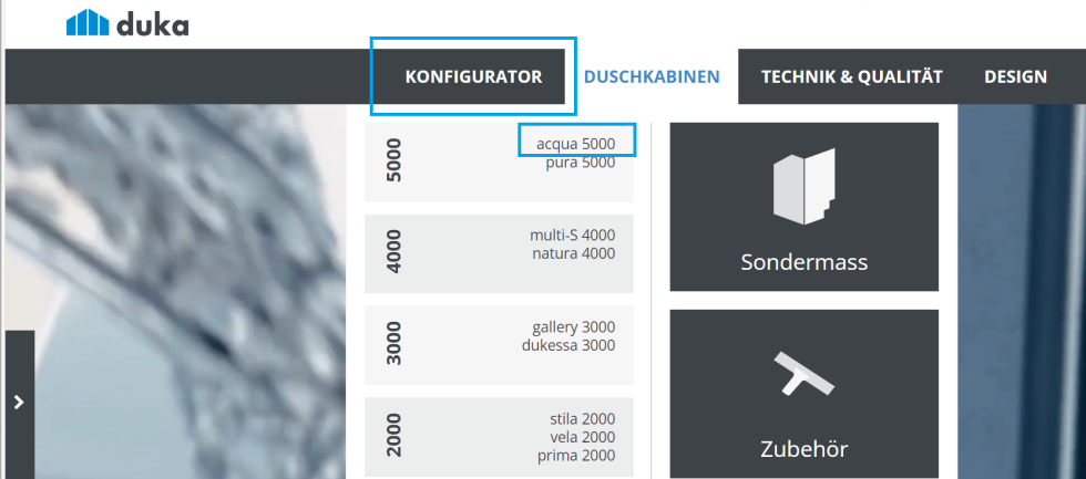 Der Konfigurator ist jetzt als „Stand-Alone-Lösung“ ohne Registrierung auf unserer Website verfügbar! Steigen Sie über den Punkt „Konfigurator“ im Hauptmenü ein und wählen Sie die am besten geeigneten Modelle über einfache und intuitive Filter aus. Wenn Sie Ihre Traum-Duschkabine bereits kennen, öffnen sie den Konfigurator über die Produktseite Ihrer Lieblingsserie und erhalten Sie ein gefiltertes Ergebnis.