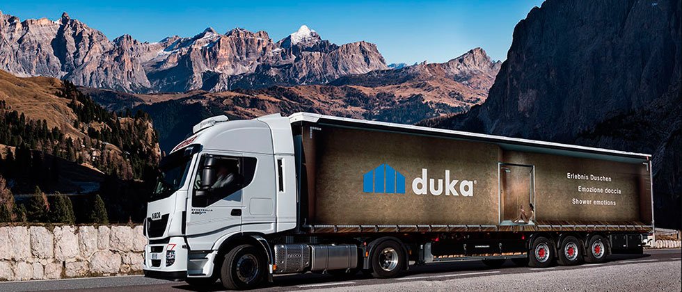 Eine der wesentlichen Bestandteile eines ausgezeichneten Produkts ist der Service, mit welchem es angeboten wird. Die LKW’s von Duka „On the Road“ gewährleisten nicht nur eine schnelle und zuverlässige Lieferung, sondern transportieren nun auch den Unternehmensslogan „Erlebnis Duschen“ durch „Erlebnis Design“ auf der Straße