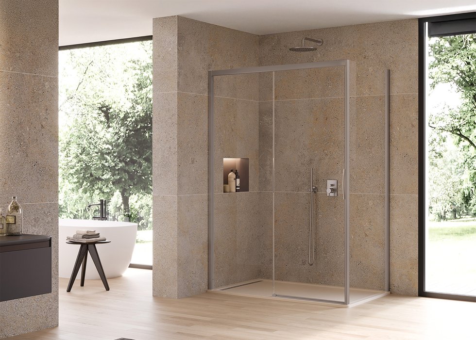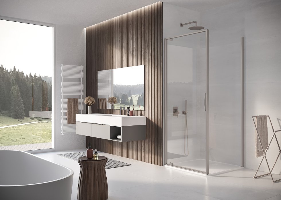 Die gebürstete Struktur bringt die präzisen Details der Serie eindrucksvoll zur Geltung. Griff, Magnetleiste, Profile und die Rohrscharniere – in INO ausgeführt – verleihen der Duschkabine eine besondere Ausstrahlung und betonen ihre moderne Ästhetik.